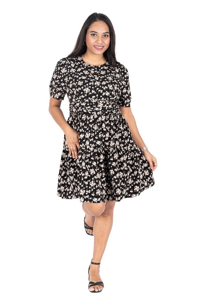 Styling-a knee length, short-sleeved, a gathered or ruched bodice and a tiered skirt, creating a flowy silhouette, casual and feminine, suitable for various occasions like brunch, day out, or relaxed event.
